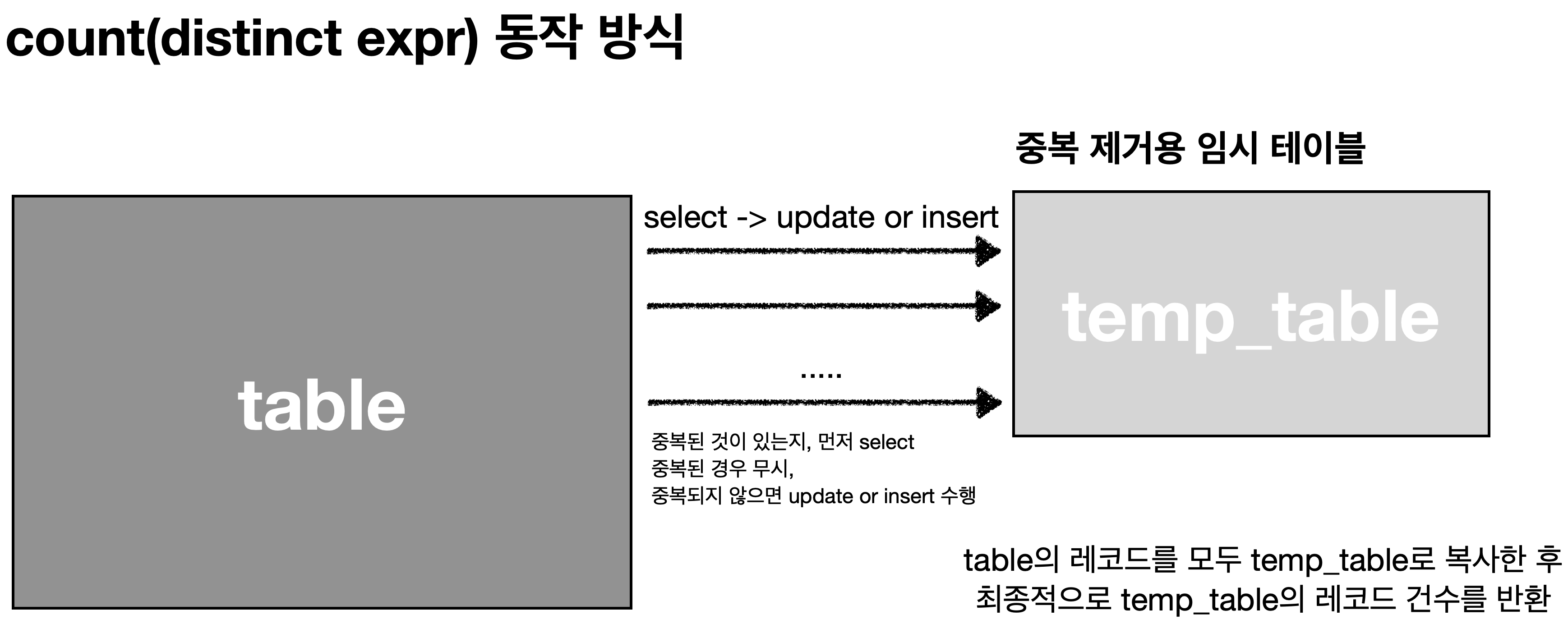 반면에, count (distinct expr)은 임시 테이블로 중복 제거후 건수를 확인합니다.